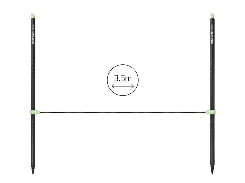 RangeX FREE besteht aus zwei Distanzstangen mit Einkerbungen. Diese Einkerbungen dienen dazu, die Schnur darin zu legen, sodass beim Messen der Entfernung kein unerwünschtes Verrutschen der Schnur von der Stange droht. Zur leichteren Verwendung in der Dämmerung oder Dunkelheit verfügen die Stangen über phosphoreszierende Endstücke, die nach dem Beleuchten leuchten. Für eine bessere Handhabung beim Einstecken in den Boden sind die Distanzstangen am unteren Ende mit einer festen Spitze mit dem Gewinde ausgestattet. Selbstverständlich gehört dazu auch ein 3,5 Meter langes Messseil, das an beiden Enden mit den Ösen zur Befestigung an den Stangen versehen ist. Das RangeX FREE wird in einer praktischen Textiltasche geliefert, damit Sie immer alles beisammen haben.