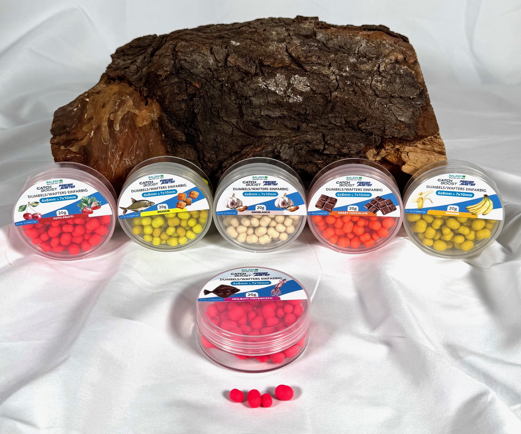 Einfarbige Dumbells (Wafter) 6x8mm und 7x10mm gemischt, orange-sweet chocolate. Wafter sind speziell austarierte Angelköder, die im Wasser nahezu schwerelos sind. Sie sind weder zu schwer, noch zu leicht und schweben daher leicht über dem Gewässergrund oder werden nur durch das Gewicht des Hakens am Boden gehalten. Diese Eigenschaft macht sie für Fische besonders attraktiv, da sie den Köder leichter aufnehmen können, ohne viel Widerstand zu spüren. Durch die mittig nach innen gewölbte Form halten Dumbbells (englisch für Hantel) deutlich besser im Pellet Band als herkömmliche Pellets. Praktisch auch die Mixpackungen (immer 2 unterschiedliche Größen pro Packung) wodurch Sie flexibel auf das Beißverhalten der Fische reagieren können.