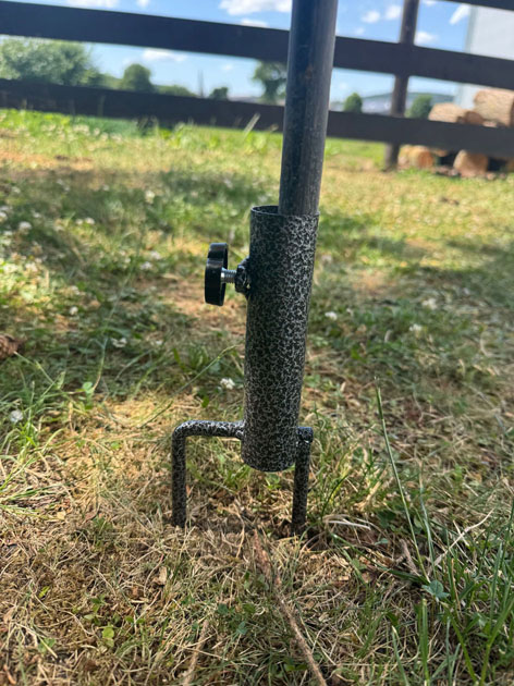 Der Schirmstab wird anschließend in den 25 mm Rohrdurchmesser eingesetzt und mit der Feststellschraube sicher fixiert. So bleibt alles an Ort und Stelle, egal ob beim Ansitz, beim Regen oder in der prallen Sonne.