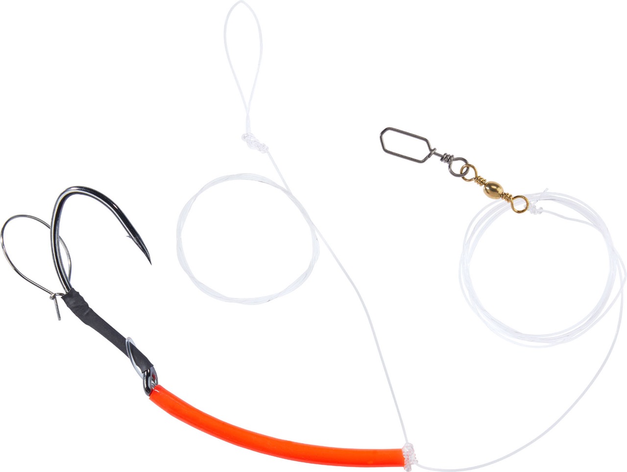 Der Clou: Der Ring des Hakens lässt sich öffnen, wird durch die Nase des Köderfischs geführt und anschließend wieder geschlossen – schnell, sicher und vor allem zuverlässig, auch bei kräftigen Bissen großer Meeresfische. Die verschweißte Öse sorgt für zusätzliche Stabilität.