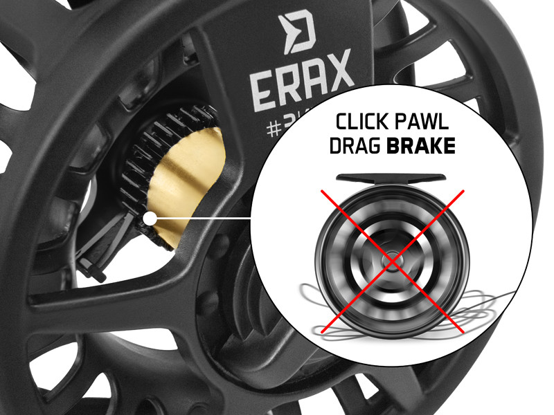 Ein großer Vorteil der ERAX Fliegenrolle ist die empfindliche Bremse, die im Rollengehäuse versteckt ist, da sie unempfindlich gegenüber Sand und anderen unerwünschten Verschmutzungen ist, insbesondere wenn die Rolle beim Angeln mit dem Wasser getränkt ist. Die Bremse ist mit einem Perc-System ausgestattet, dank dem es auch bei den schnellen Schlägen nicht zu einem unerwünschten Abwickeln der Schnur kommt, wodurch verschiedene Knoten vermieden werden, die zum Verlust des Fangs beim Angeln führen könnten.