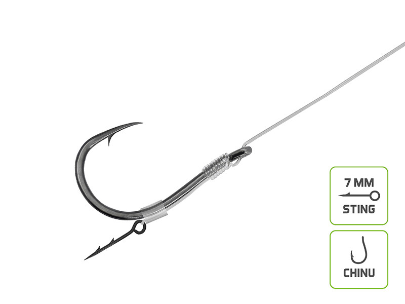 Gefertigt aus hochwertigem Fluorocarbon, sind die Vorfächer unter Wasser nahezu unsichtbar für Fische und bieten gleichzeitig eine hohe Abriebsfestigkeit. Dadurch eignen sie sich perfekt für den Einsatz in hindernisreichen Gewässern oder auf hartem Untergrund. Die verbauten Chinu Haken zeichnen sich durch ihre robuste Form, hohe Stabilität und extreme Schärfe aus. Sie sorgen für ein sicheres Eindringen im Fischmaul und bieten hervorragenden Halt im Drill – auch bei vorsichtigen Bissen. So minimierst du effektiv das Risiko von Fehlbissen oder Aussteigern. Ein integrierter 7 mm Köderdorn ermöglicht das schnelle und sichere Anbringen verschiedenster Köder wie Wafters oder Mini-Boilies, wodurch du flexibel auf unterschiedliche Bedingungen reagieren kannst.