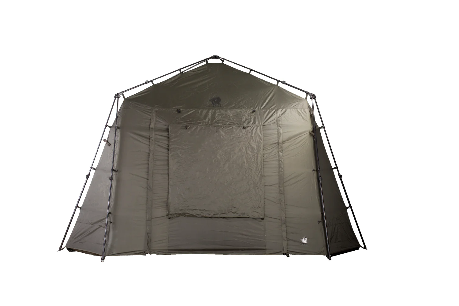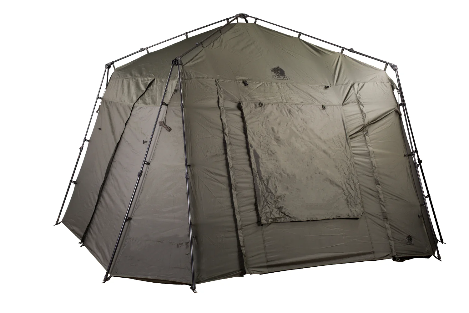 Das Bank Life Gazebo wird zum Treffpunkt bei langen Urlaubs-Sessions wenn man gemeinsam Zeit mit Freunden beim Essen oder Trinken verbringt, um seine Fänge zu vergleichen oder einfach nur um zusammen eine angenehmen Zeit zu verbringen. In die Entwicklung des Gazebo ist ganz viel Nash-Entwicklergeist geflossen – trotz der kolossalen Grundfläche und der beeindruckenden Höhe von über 2.13m kann es durch den starken Aluminium-Rahmen spielerisch von nur einer Person aufgestellt werden. Es müssen keine Stangen zusammengesteckt werden, der Rahmen bleibt in einem Stück. Durch die Quick Lock Verschlüsse können die Stangen auseinandergezogen werden, bis sie einrasten. Der mittlere Block gibt dem Gazebo daraufhin seine finale Form. Das Gazebo kommt mit Türen an allen vier Seiten. Eine davon mit doppeltem Zipp, Gurten und Schnallen um den Eingang zu sichern, die anderen mit zentralen Öffnungen und elastischen Zugbändern an den Seiten. Zwei der vier Seiten haben KlettverschlussStorm Panele Zusätzlich mit Mesh-Material für ausreichend Luftzirkulation. Ein weiteres Highlight ist, dass auf zwei Seiten entweder ein Titan oder ein Double Top mit dem Gazebo verbunden werden können. So entsteht ein großzügiger, trockener Aufenthaltsbereich zwischen den beiden Bivvies.
